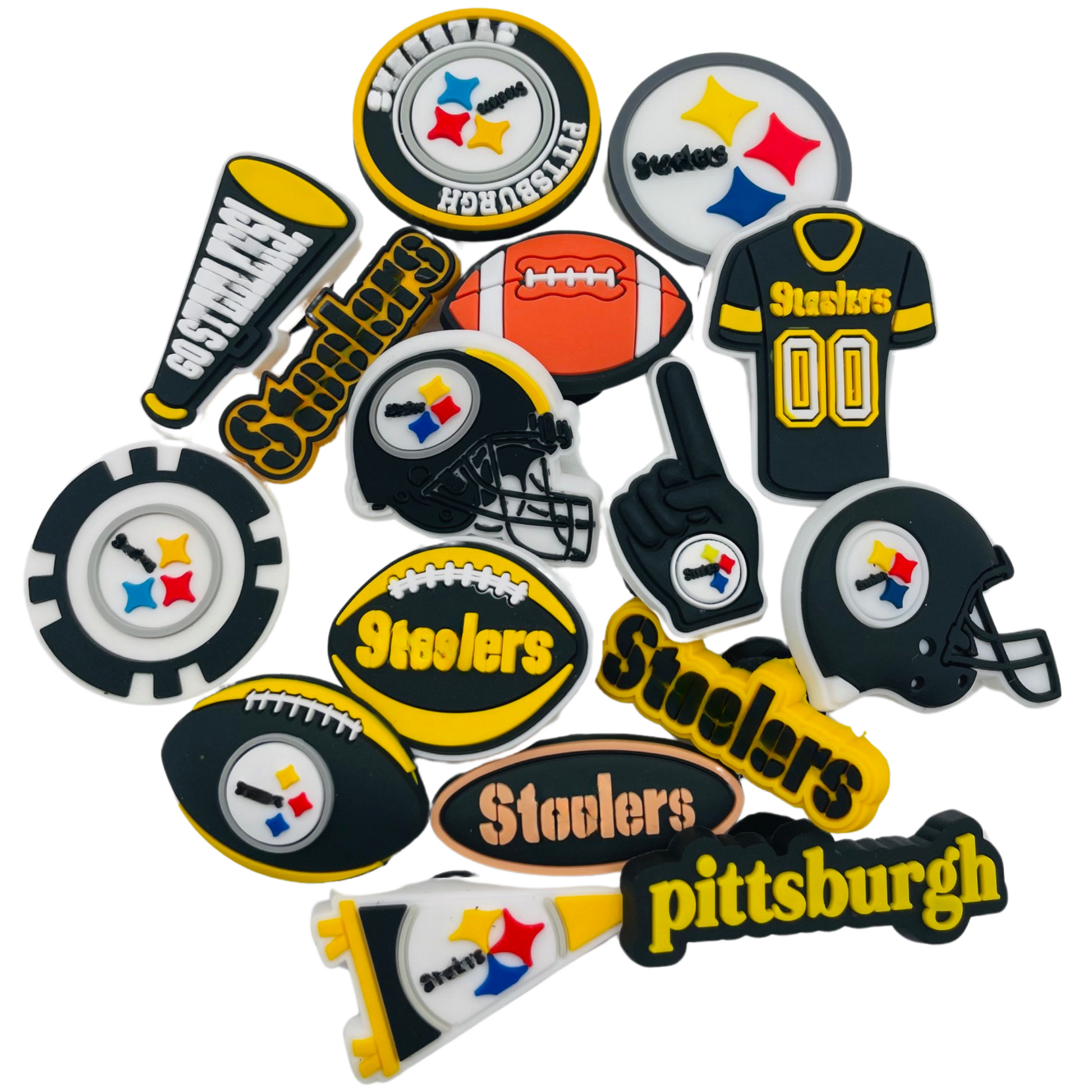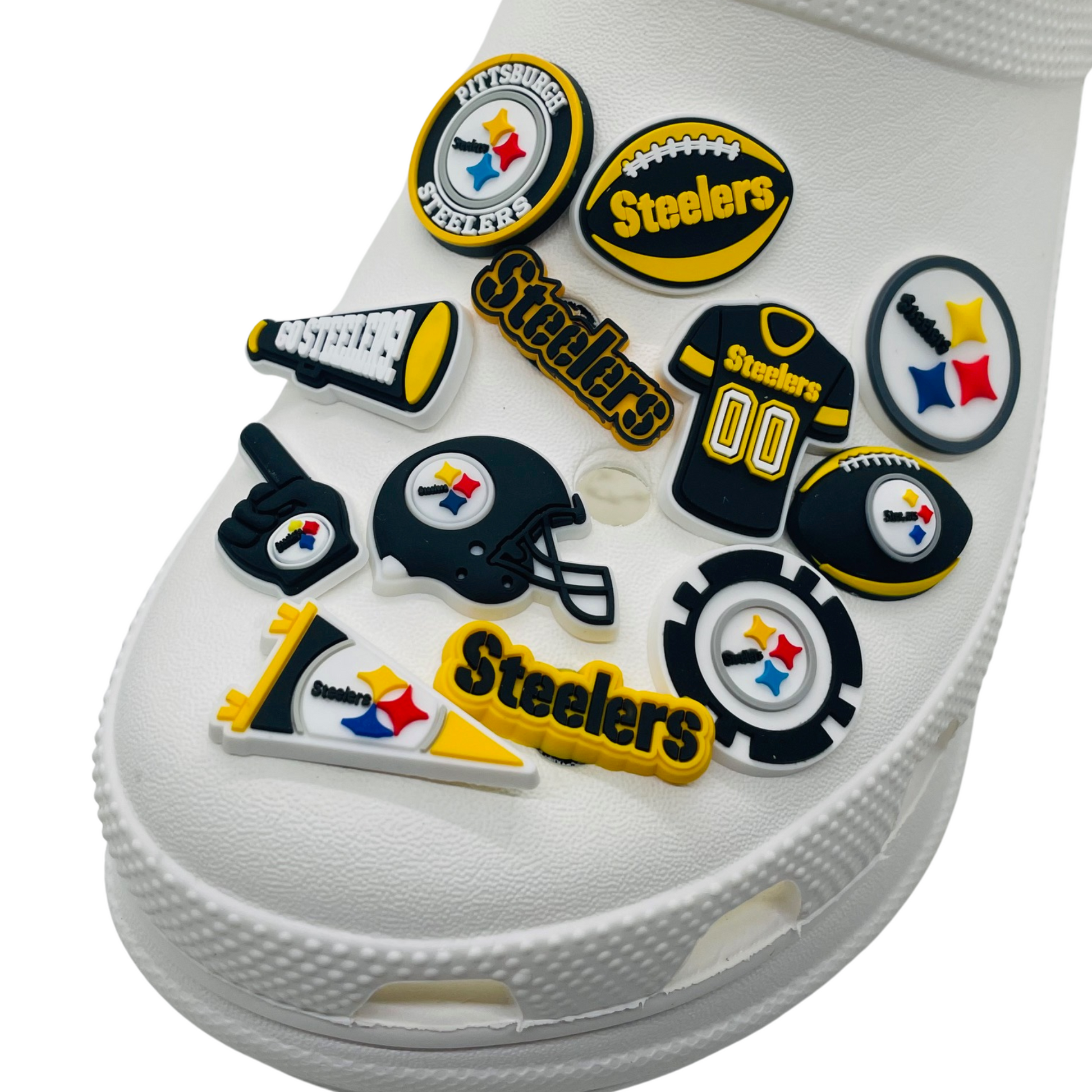 Show off your black-and-gold pride with this complete 16-piece Pittsburgh themed Croc charms set! Perfect for adding team spirit to your favorite clogs, sandals, or charm bracelets, these high-quality rubber charms are durable, waterproof, and easy to install. Whether you’re heading to the stadium, tailgating, or just want to rep your team every day, these charms let your footwear make a winning statement.